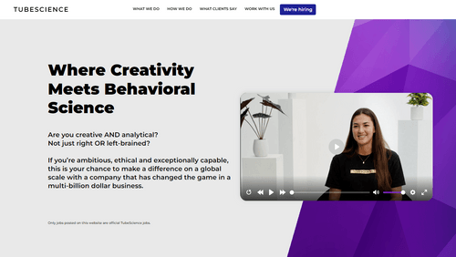 TubeScience Studios is a content creation company that produces large volumes of user-centric videos designed to engage a diverse set of personas. What sets them apart from other content creators is that they produce content on their own dime, and only get paid if the content they created outperforms the clients original content created by in house creatives.